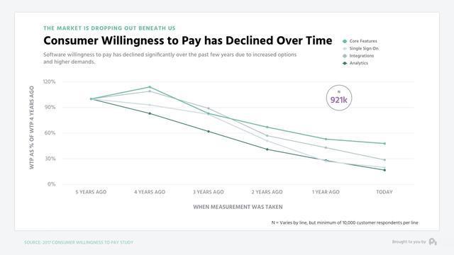 当你查看超过900,000个客户数据时,你会注意到产品和功能在过去的五年里,已经失去了70% 的价值,这意味着你过去每月100美元销售的 Salesforce 产品,现在只值30美元。甚至在一些特殊个例中,仅仅只有核心功能才能谈得上价值消退。